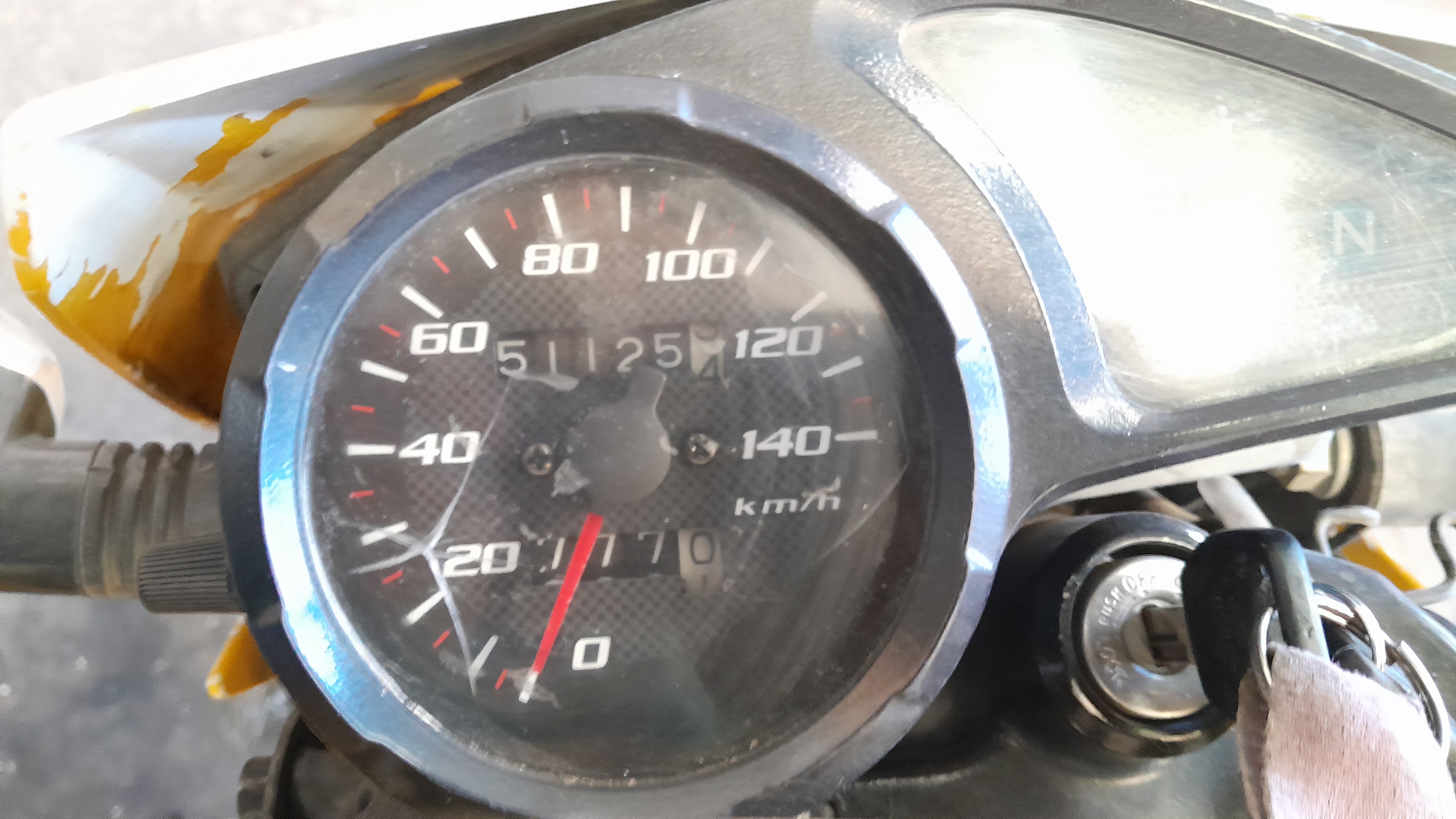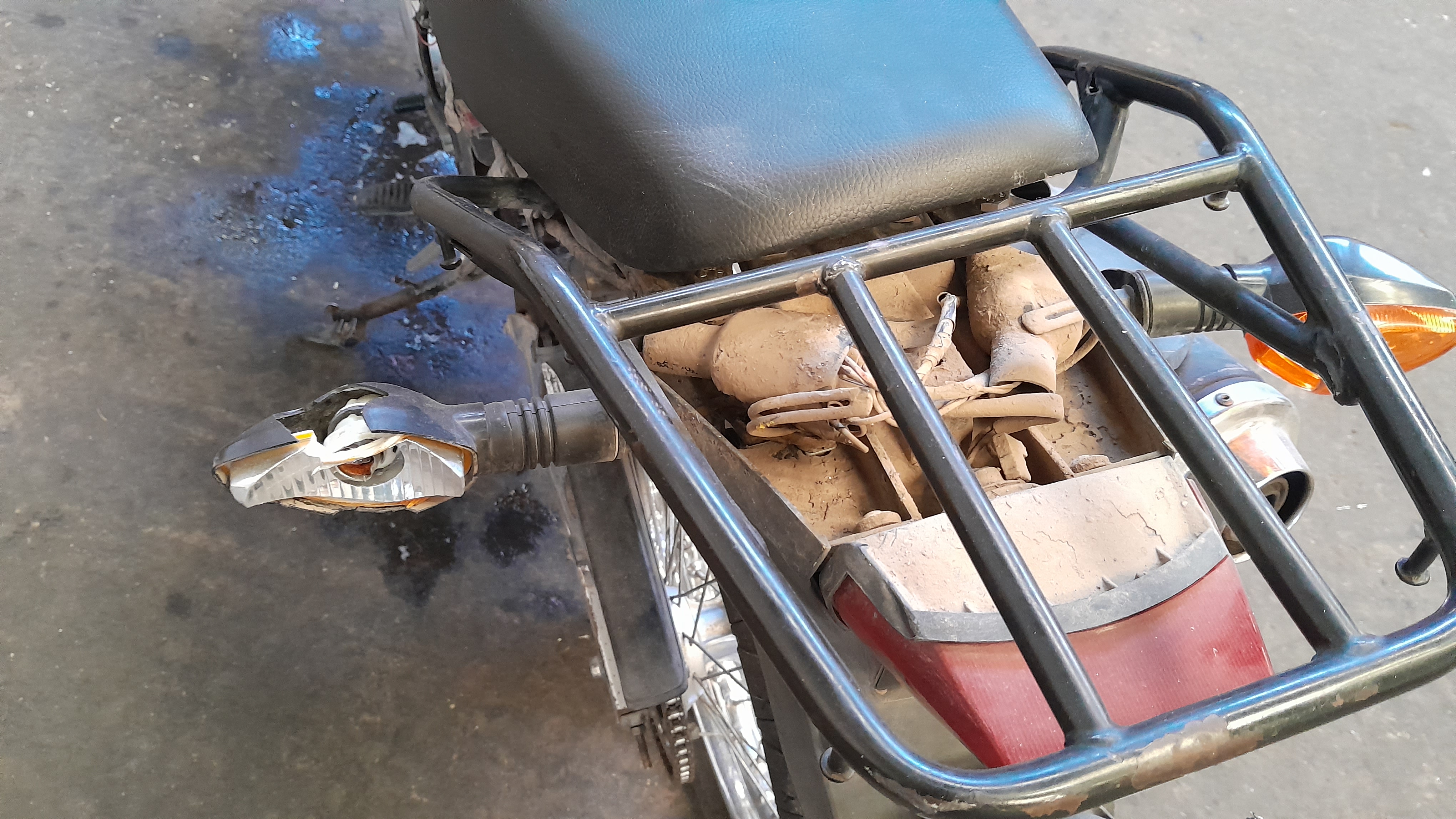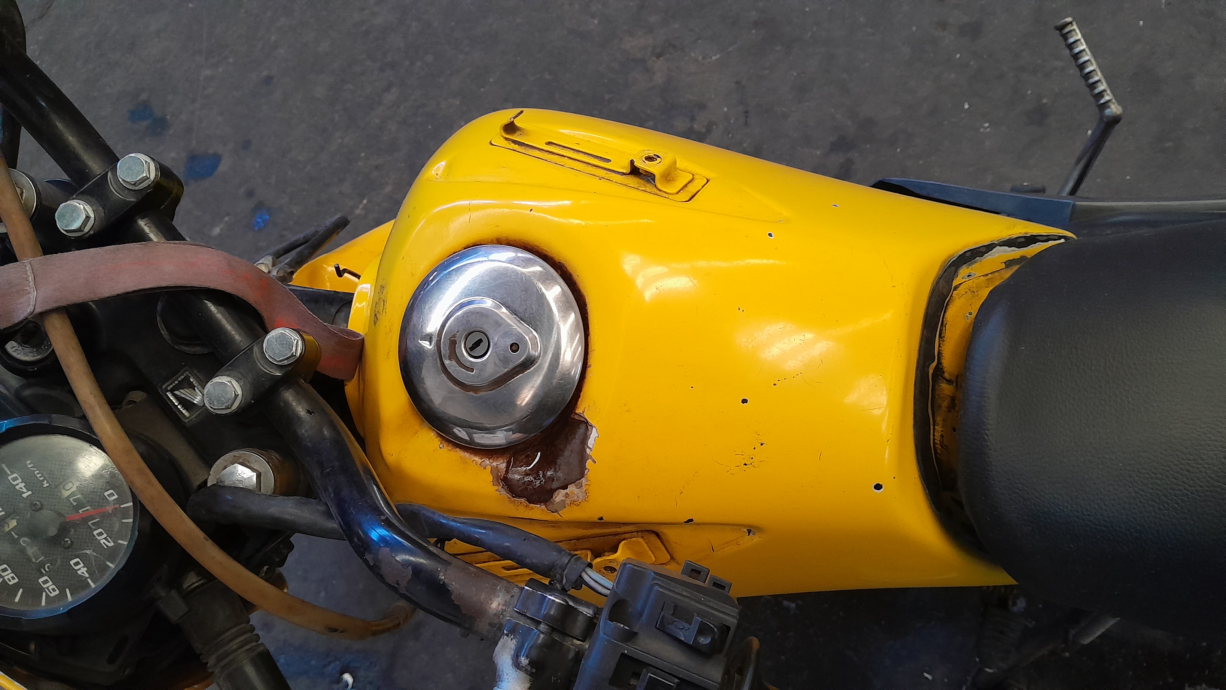 CACHA LATERALES FALTANTES, BOLLO EN EL TANQUE, ASIENTO SUELTO, GIRO TRAS IZQ ROTO, ESPEJOS RET FALTANTES, PUÑO ACELERADOR FALTANTE, CACHA TRASERA FALTANTE |