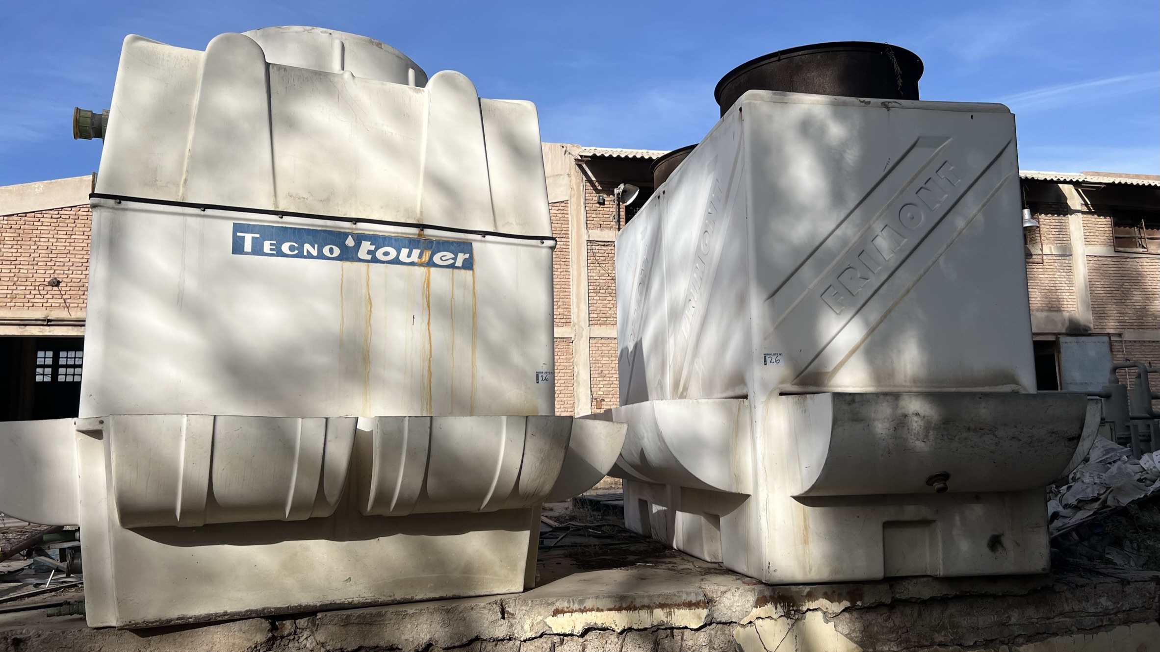 Lote 326: Subasta de Activos - Monasterio Tattersall Inicios Productos Información Contacto Lote Anterior Volver al remate Lote Siguiente Imágenes Categoría: Otros Localidad: Mendoza Exhibición: Lunes 11 y Martes 12 de Septiembre de 9 a 15hs. Coordinar visita Sebastian 1161230016 - Agustin 1126312630 Mandante: GRUPO PEÑAFLOR S.A. Observaciones: 2 TORRES DE ENFRIAMIENTO - 1 FRIMONT Y OTRA TECNO TOWER MOD: T2109M5 Argentina, Mendoza Bruno +54 (911) 5745 0057 Email: claurenzana@monasterio.com.ar Subasta de Activos - Monasterio Tattersall * * *