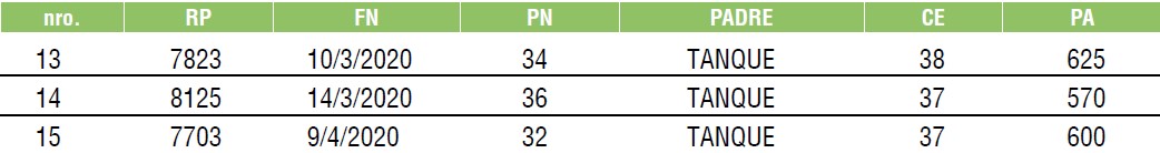 LOTE 49, TOROS ANGUS COLORADOS PC Lote Anterior Volver al remate Lote Siguiente Información del Lote Animales del Lote Pedigree Ofertar Contacto Buenos Aires - La Legua, Coronel Pringles, Prov. BA Información del Lote Identificador: #160085 Cantidad 3 Categoría Toros PC Raza Angus Colorado Provincia Buenos Aires Ubicación La Legua, Coronel Pringles, Prov. BA Buenos Aires - La Legua, Coronel Pringles, Prov. BA Ofertar Fecha de cierre: 08 de Junio a las 23:00hs. Aún no tiene ofertas Animales: (13)-7823 (14)-8125 (15)-7703 Plazo: Contado 7 y 14 días 15 días 30 y 60 del remate 20 días 21 dias 30 del remate 30 días 30 y 45 dias 40 días 25 días del remate 45 días 30 y 60 días 25 y 55 días 0, 30 y 60 días 25 días 55 días 60 días 60, 90 y 120 días 30, 60 y 90 días 70 días 60 y 90 días 35 y 65 días 30 y 50 días 25 y 40 días 30 y 40 días 90 días 50 y 100 días 120 días 60 días del remate 30 y 45 Días del Remate 30 y 45 Días 20/50 y 80 días 30 días del remate 30 y 60 días del remate 30, 60 y 90 días del remate 30 y 45 Días 50 y 80 días 20 y 50 días 45 Días del Remate 17 días 15 - 50 días 28 días 30-60-90 O 60 25-55-85 25-45 días 18 días Desde el Remate 150 días 180 días 25, 55 y 85 días 30, 60, 90, 120 y 150 días 30, 60, 90 y 120 días 0, 30, 60 y 90 dias 20, 40 y 60 días 6 Cuotas Otro Consultar Su Oferta en $: − + Step: -10.000,00 / +10.000,00 Programar puja hasta: Programar puja hasta Aumentar puja programada 320000 500000 **Oferta al bulto Iniciar sesión para ofertar Ofertar Compra por $ 99.000.000,00 Ofertas Recibidas $ Fecha/Hora Estado Este lote aún no tiene preofertas. ¿Estás seguro de comprar el LOTE TOROS ANGUS COLORADOS PC por $ 99000000 ? 78 Visualizaciones ClicData Animales del Lote RP (13)-7823 (14)-8125 (15)-7703 PADRE TANQUE TANQUE TANQUE NAC 10/3/2020 14/3/2020 9/4/2020 CE 38 37 37 PF 625 570 600 PN 34 36 32 PRECIO BASE 0.00 0.00 0.00 RP (13)-7823 PADRE TANQUE NAC 10/3/2020 CE 38 PF 625 PN 34 PRECIO BASE 0.00 RP (14)-8125 PADRE TANQUE NAC 14/3/2020 CE 37 PF 570 PN 36 PRECIO BASE 0.00 RP (15)-7703 PADRE TANQUE NAC 9/4/2020 CE 37 PF 600 PN 32 PRECIO BASE 0.00 Pedigree Contacto Empresa: LANUSSE-SANTILLAN Y CIA. S.A. Nombre*: E-mail* : Mensaje Enviar Registrese gratis Este contenido Exclusivo está disponible sólo para usuarios registrados Ingresar