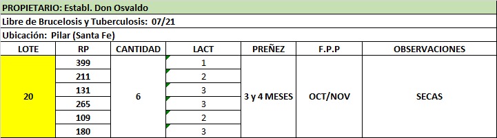 LOTE 20, Est. Don Osvaldo - Secas 🔥 🔥 🔥 Lote Anterior Volver al remate Lote Siguiente Ficha Contacto Santa Fe - Pilar Ficha del Lote Identificador: #164240 Cantidad: 6 Categoría: Vacas en produccion Pedigree Plazo 30, 60, 90 y 120 días Santa Fe - Pilar 54 Visualizaciones ClicData Contacto Comercial a cargo: Alan Zbrun Empresa: Cooperativa Agrícola Ganadera Guillermo Lehmann Nombre*: Teléfono* : E-mail* : Mensaje Enviar Registrese gratis Este contenido Exclusivo está disponible sólo para usuarios registrados Ingresar