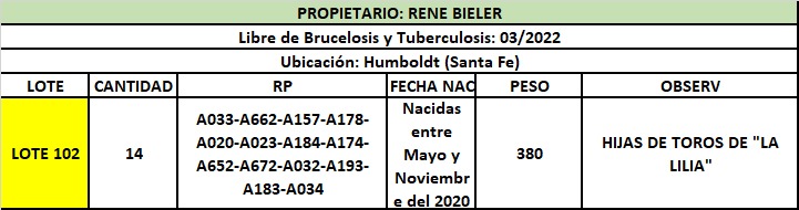 LOTE 102, Rene Bieler - Vaquillonas Para Entorar Lote Anterior Volver al remate Lote Siguiente Ficha Contacto Santa Fe - Humboldt Ficha del Lote Identificador: #164460 Cantidad: 14 Categoría: Vacas P/ entorar Peso: 250Kg. Pedigree Plazo 30, 60, 90 y 120 días Santa Fe - Humboldt 32 Visualizaciones ClicData Contacto Comercial a cargo: Alan Zbrun Empresa: Cooperativa Agrícola Ganadera Guillermo Lehmann Nombre*: Teléfono* : E-mail* : Mensaje Enviar Registrese gratis Este contenido Exclusivo está disponible sólo para usuarios registrados Ingresar