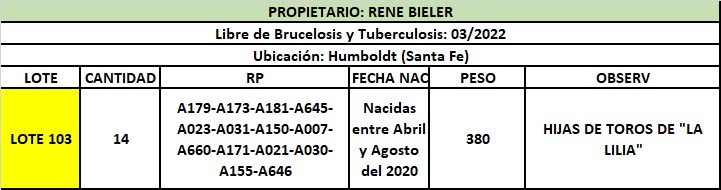LOTE 103, Rene Bieler - Vaquillonas Para Entorar Lote Anterior Volver al remate Lote Siguiente Ficha Contacto Santa Fe - Humboldt Ficha del Lote Identificador: #164461 Cantidad: 14 Categoría: Vacas P/ entorar Peso: 250Kg. Pedigree Plazo 30, 60, 90 y 120 días Santa Fe - Humboldt 34 Visualizaciones ClicData Contacto Comercial a cargo: Alan Zbrun Empresa: Cooperativa Agrícola Ganadera Guillermo Lehmann Nombre*: Teléfono* : E-mail* : Mensaje Enviar Registrese gratis Este contenido Exclusivo está disponible sólo para usuarios registrados Ingresar