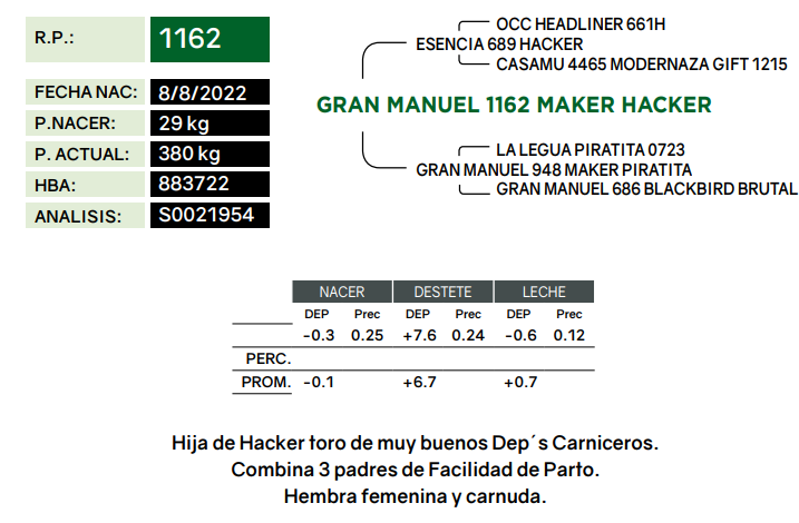 LOTE 38 - RP 1162, TERNERAS PEDIGREE Lote Anterior Volver al remate Lote Siguiente Información del Lote Animal Pedigree Ofertar Contacto Buenos Aires - Balcarce Información del Lote Identificador: #232811 Categoría Terneras Provincia Buenos Aires Ubicación Balcarce Propietario La Distancia Buenos Aires - Balcarce Ofertar Fecha de cierre: 01 de Septiembre a las 20:00hs. Aún no tiene ofertas Animales: 1162 Plazo: Contado 7 y 14 días 15 días 30 y 60 del remate 20 días 21 dias 30 del remate 30 días 30 y 45 dias 40 días 25 días del remate 45 días 30 y 60 días 25 y 55 días 0, 30 y 60 días 25 días 55 días 60 días 60, 90 y 120 días 30, 60 y 90 días 70 días 60 y 90 días 35 y 65 días 30 y 50 días 25 y 40 días 30 y 40 días 90 días 50 y 100 días 120 días 60 días del remate 30 y 45 Días del Remate 30 y 45 Días 20/50 y 80 días 30 días del remate 30 y 60 días del remate 30, 60 y 90 días del remate 30 y 45 Días 50 y 80 días 20 y 50 días 45 Días del Remate 17 días 15 - 50 días 28 días 30-60-90 O 60 25-55-85 25-45 días 18 días Desde el Remate 150 días 180 días 25, 55 y 85 días 30, 60, 90, 120 y 150 días 30, 60, 90 y 120 días 0, 30, 60 y 90 dias 20, 40 y 60 días 6 Cuotas Otro Consultar Su Oferta en $: − + Step: -50.000,00 / +50.000,00 Programar puja hasta: Programar puja hasta Aumentar puja programada 550000 1450000 **Oferta al bulto Iniciar sesión para ofertar Ofertar Compra por $ 99.000.000,00 Ofertas Recibidas $ Fecha/Hora Estado Este lote aún no tiene preofertas. ¿Estás seguro de comprar el LOTE TERNERAS PEDIGREE por $ 99000000 ? 36 Visualizaciones ClicData Animal RP 1162 PADRE HACKER MADRE 948 NAC 8/8/2022 PRECIO BASE 0.00 RP 1162 PADRE HACKER MADRE 948 NAC 8/8/2022 PRECIO BASE 0.00 Pedigree Contacto Empresa: Pedro Noel Irey S.R.L. Nombre*: E-mail* : Mensaje Enviar