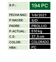 LOTE 59 - RP 194, TOROS PUROS CONTROLADOS Lote Anterior Volver al remate Lote Siguiente Información del Lote Animal Pedigree Ofertar Contacto Buenos Aires - Balcarce Información del Lote Identificador: #232855 Categoría Toros Provincia Buenos Aires Ubicación Balcarce Propietario La Distancia Buenos Aires - Balcarce Ofertar Fecha de cierre: 01 de Septiembre a las 20:00hs. Aún no tiene ofertas Animales: 194 Plazo: Contado 7 y 14 días 15 días 30 y 60 del remate 20 días 21 dias 30 del remate 30 días 30 y 45 dias 40 días 25 días del remate 45 días 30 y 60 días 25 y 55 días 0, 30 y 60 días 25 días 55 días 60 días 60, 90 y 120 días 30, 60 y 90 días 70 días 60 y 90 días 35 y 65 días 30 y 50 días 25 y 40 días 30 y 40 días 90 días 50 y 100 días 120 días 60 días del remate 30 y 45 Días del Remate 30 y 45 Días 20/50 y 80 días 30 días del remate 30 y 60 días del remate 30, 60 y 90 días del remate 30 y 45 Días 50 y 80 días 20 y 50 días 45 Días del Remate 17 días 15 - 50 días 28 días 30-60-90 O 60 25-55-85 25-45 días 18 días Desde el Remate 150 días 180 días 25, 55 y 85 días 30, 60, 90, 120 y 150 días 30, 60, 90 y 120 días 0, 30, 60 y 90 dias 20, 40 y 60 días 6 Cuotas Otro Consultar Su Oferta en $: − + Step: -50.000,00 / +50.000,00 Programar puja hasta: Programar puja hasta Aumentar puja programada 800000 1700000 **Oferta al bulto Iniciar sesión para ofertar Ofertar Compra por $ 99.000.000,00 Ofertas Recibidas $ Fecha/Hora Estado Este lote aún no tiene preofertas. ¿Estás seguro de comprar el LOTE TOROS PUROS CONTROLADOS por $ 99000000 ? 8 Visualizaciones ClicData Animal RP 194 PADRE PROLIJO MADRE PC NAC 1/8/2021 PRECIO BASE 0.00 RP 194 PADRE PROLIJO MADRE PC NAC 1/8/2021 PRECIO BASE 0.00 Pedigree Contacto Empresa: Pedro Noel Irey S.R.L. Nombre*: E-mail* : Mensaje Enviar