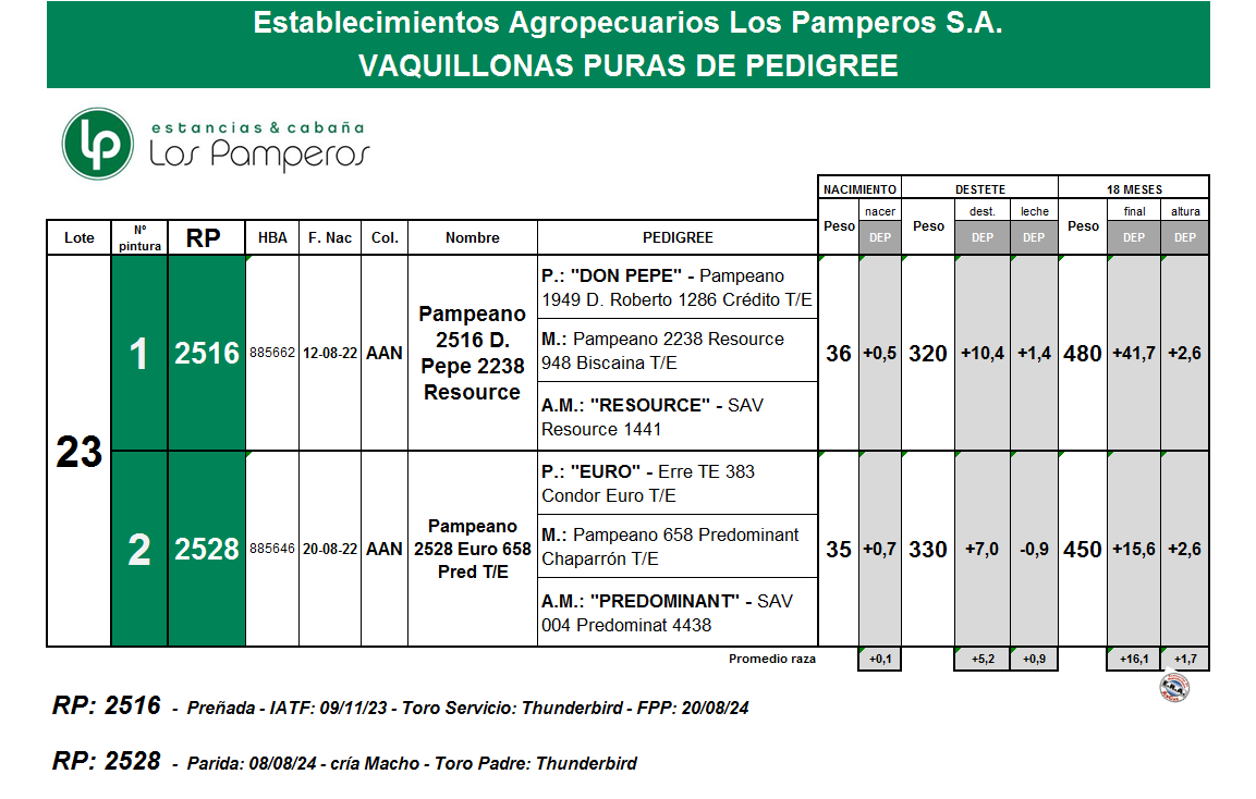 LOTE 23, VAQUILLONAS PURAS DE PEDIGREE 🔥 🔥 🔥 Lote Anterior Volver al remate Lote Siguiente Información del Lote Animales del Lote Pedigree Ofertar Contacto Buenos Aires - Bolivar Información del Lote Identificador: #286479 Cantidad 2 Categoría Vaquillonas Provincia Buenos Aires Ubicación Bolivar Buenos Aires - Bolivar Ofertar Fecha de cierre: 21 de Agosto a las 18:00hs. Aún no tiene ofertas Animales: 2516 2528 Plazo: Contado 7 y 14 días 15 días 30 y 60 del remate 20 días 21 dias 30 del remate 30 días 30 y 45 dias 40 días 25 días del remate 45 días 30 y 60 días 25 y 55 días 0, 30 y 60 días 25 días 55 días 60 días 60, 90 y 120 días 30, 60 y 90 días 70 días 60 y 90 días 35 y 65 días 30 y 50 días 25 y 40 días 30 y 40 días 90 días 50 y 100 días 120 días 60 días del remate 30 y 45 Días del Remate 30 y 45 Días 20/50 y 80 días 30 días del remate 30 y 60 días del remate 30, 60 y 90 días del remate 30 y 45 Días 50 y 80 días 20 y 50 días 45 Días del Remate 17 días 15 - 50 días 28 días 30-60-90 O 60 25-55-85 25-45 días 18 días Desde el Remate 150 días 180 días 25, 55 y 85 días 30, 60, 90, 120 y 150 días 30, 60, 90 y 120 días 0, 30, 60 y 90 dias 20, 40 y 60 días 6 Cuotas Otro Consultar Su Oferta en $: − + Step: -100.000,00 / +100.000,00 Programar puja hasta: Programar puja hasta Aumentar puja programada 2000000 3800000 **Oferta al bulto Iniciar sesión para ofertar Ofertar Compra por $ 99.000.000,00 Ofertas Recibidas $ Fecha/Hora Estado Este lote aún no tiene preofertas. ¿Estás seguro de comprar el LOTE VAQUILLONAS PURAS DE PEDIGREE por $ 99000000 ? 41 Visualizaciones ClicData Animales del Lote RP 2516 2528 PADRE DON PEPE - Pampeano 1949 D. Roberto 1286 Crédito T/E " ""EURO"" - Erre TE 383 Condor Euro T/E" MADRE Pampeano 2238 Resource 948 Biscaina T/E Pampeano 658 Predominant Chaparrón T/E ABUELO MATERNO RESOURCE - SAV PREDOMINANT - SAV PRECIO BASE 0.00 0.00 NOMBRE Pampeano 2516 D. Pepe 2238 Resource Pampeano 2528 Euro 658 Pred T/E RP 2516 PADRE DON PEPE - Pampeano 1949 D. Roberto 1286 Crédito T/E MADRE Pampeano 2238 Resource 948 Biscaina T/E ABUELO MATERNO RESOURCE - SAV PRECIO BASE 0.00 NOMBRE Pampeano 2516 D. Pepe 2238 Resource RP 2528 PADRE " ""EURO"" - Erre TE 383 Condor Euro T/E" MADRE Pampeano 658 Predominant Chaparrón T/E ABUELO MATERNO PREDOMINANT - SAV PRECIO BASE 0.00 NOMBRE Pampeano 2528 Euro 658 Pred T/E Pedigree Contacto Empresa: FERIAS DEL CENTRO S.R.L. Nombre*: E-mail* : Mensaje Enviar Registrese gratis Este contenido Exclusivo está disponible sólo para usuarios registrados Ingresar