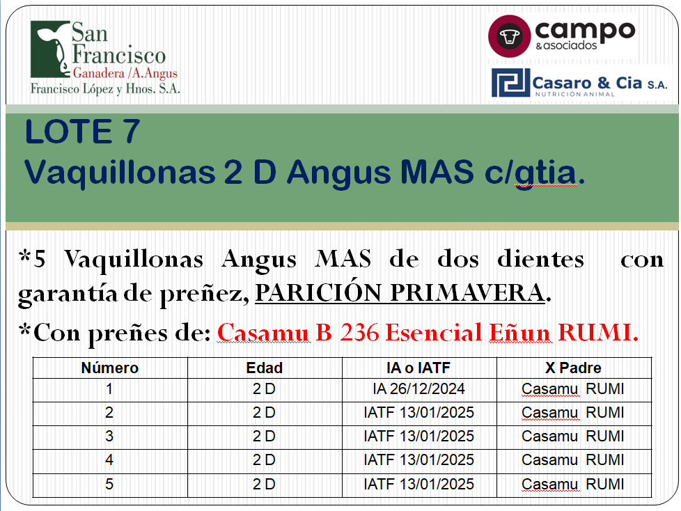 | Observaciones | 1: Edad 2D IA o IATF: IA 26/12/2024 Padre: Casamu RUMI 2: Edad 2D IA o IATF: IATF 13/01/2025 Padre: Casamu RUMI 3: Edad 2D IA o IATF: IATF 13/01/2025 Padre: Casamu RUMI 4:Edad 2D IA o IATF: IATF 13/01/2025 Padre: Casamu RUMI 5: Edad 2D IA o IATF: IATF 13/01/2025 Padre: Casamu RUMI |