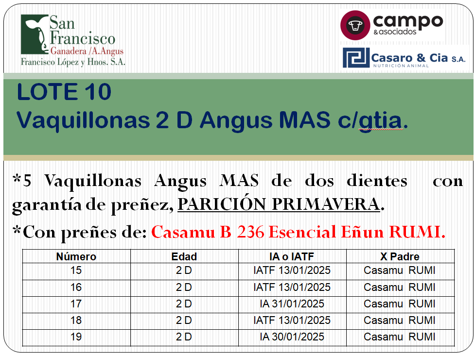 | Observaciones | 15: Edad 2D IA o IATF: IATF 13/01/2025 Padre: Casamu RUMI 16: Edad 2D IA o IATF: IATF 13/01/2025 Padre: Casamu RUMI 17: Edad 2D IA o IATF: IATF IA 31/01/2025 Padre: Casamu RUMI 18: Edad 2D IA o IATF: IATF 13/01/2025 Padre: Casamu RUMI 19: Edad 2D IA o IATF: IA 30/01/2025 Padre: Casamu RUMI |