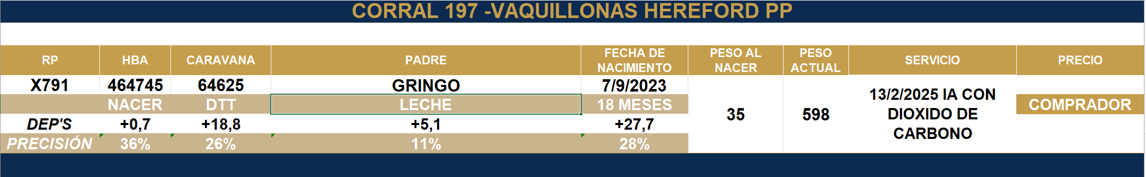 LOTE 37-Corral 197, VACA A. ANGUS NEGRA PP CON CRIA AL PIE Lote Anterior Volver al remate Lote Siguiente Ficha Contacto Ofertar Buenos Aires - Ficha del Lote Identificador: #338076 Categoría: Vacas Pedigree Información Genética RP X791 RP X791 PADRE GRINGO NACIMIENTO 7/9/2023 PESO ACTUAL 598 PESO NACER 35 PRECIO BASE 4000000.00 MOSTRAR VIDEO STREAMING 1 FECHA SERVICIO 13/2/2025 IA CON DIOXIDO DE CARBONO Buenos Aires - Ofertar Fecha de cierre: 18 de Septiembre a las 20:00hs. Aún no tiene ofertas Animales: X791 Plazo: Contado 7 y 14 días 15 días 30 y 60 del remate 20 días 21 dias 30 del remate 30 días 30 y 45 dias 40 días 25 días del remate 45 días 30 y 60 días 25 y 55 días 0, 30 y 60 días 25 días 55 días 60 días 60, 90 y 120 días 30, 60 y 90 días 70 días 60 y 90 días 35 y 65 días 30 y 50 días 25 y 40 días 30 y 40 días 90 días 50 y 100 días 120 días 60 días del remate 30 y 45 Días del Remate 30 y 45 Días 20/50 y 80 días 30 días del remate 30 y 60 días del remate 30, 60 y 90 días del remate 30 y 45 Días 50 y 80 días 20 y 50 días 45 Días del Remate 17 días 15 - 50 días 28 días 30-60-90 O 60 25-55-85 25-45 días 18 días Desde el Remate 150 días 180 días 25, 55 y 85 días 30, 60, 90, 120 y 150 días 30, 60, 90 y 120 días 0, 30, 60 y 90 dias 20, 40 y 60 días 6 Cuotas Otro Consultar Su Oferta en $: − + Step: -400.000,00 / +400.000,00 Programar puja hasta: Programar puja hasta Aumentar puja programada 4800000 12000000 **Oferta al bulto Iniciar sesión para ofertar Ofertar Compra por $ 99.000.000,00 Ofertas Recibidas $ Fecha/Hora Estado Este lote aún no tiene preofertas. ¿Estás seguro de comprar el LOTE VACA A. ANGUS NEGRA PP CON CRIA AL PIE por $ 99000000 ? 46 Visualizaciones ClicData Contacto Empresa: MONASTERIO TATTERSALL S.A. Nombre*: Teléfono* : E-mail* : Mensaje Enviar Registrese gratis Este contenido Exclusivo está disponible sólo para usuarios registrados Ingresar