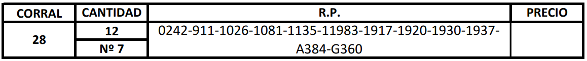 LOTE 28, VACAS ANGUS COLORADO MAS C/ GTIA DE PREÑEZ PARICION OTOÑO Lote Anterior Volver al remate Lote Siguiente Ficha Contacto Ofertar Buenos Aires - Ficha del Lote Identificador: #338621 Cantidad: 12 Categoría: Vacas Pedigree Descripción: SERVICIO NATURAL CON TOROS DE LA CABAÑA DEL 1/6/25 AL 31/07/25 Buenos Aires - Ofertar Fecha de cierre: 24 de Septiembre a las 15:00hs. Aún no tiene ofertas Plazo: Contado 7 y 14 días 15 días 30 y 60 del remate 20 días 21 dias 30 del remate 30 días 30 y 45 dias 40 días 45 días 25 días del remate 30 y 60 días 0, 30 y 60 días 25 y 55 días 25 días 55 días 60 días 60, 90 y 120 días 30, 60 y 90 días 60 y 90 días 70 días 35 y 65 días 30 y 50 días 25 y 40 días 30 y 40 días 90 días 50 y 100 días 120 días 30, 60, 90, 120, 150 Días 20/50 y 80 días 30 y 45 Días 30 y 45 Días del Remate 60 días del remate 30, 60, 90, 120, 150 Días del Remate 30 días del remate 30 y 60 días del remate 30, 60 y 90 días del remate 30 y 45 Días 50 y 80 días 20 y 50 días 45 Días del Remate 25-55 desde el Remate 17 días 15 - 50 días 30-60-90 O 60 28 días 25-55-85 25-45 días 18 días Desde el Remate 150 días 180 días 25, 55 y 85 días 30, 60, 90, 120 y 150 días 30, 60, 90 y 120 días 0, 30, 60 y 90 dias 6 Cuotas 20, 40 y 60 días Otro Consultar Su Oferta en $: − + Step: -0,01 / +0,01 Programar puja hasta: Programar puja hasta Aumentar puja programada 1400000.02 1400000.2 ** Iniciar sesión para ofertar Ofertar Ofertas Recibidas $ Fecha/Hora Estado Este lote aún no tiene preofertas. 26 Visualizaciones ClicData Contacto Empresa: Cía La Legua S.A. Nombre*: Teléfono* : E-mail* : Mensaje Enviar