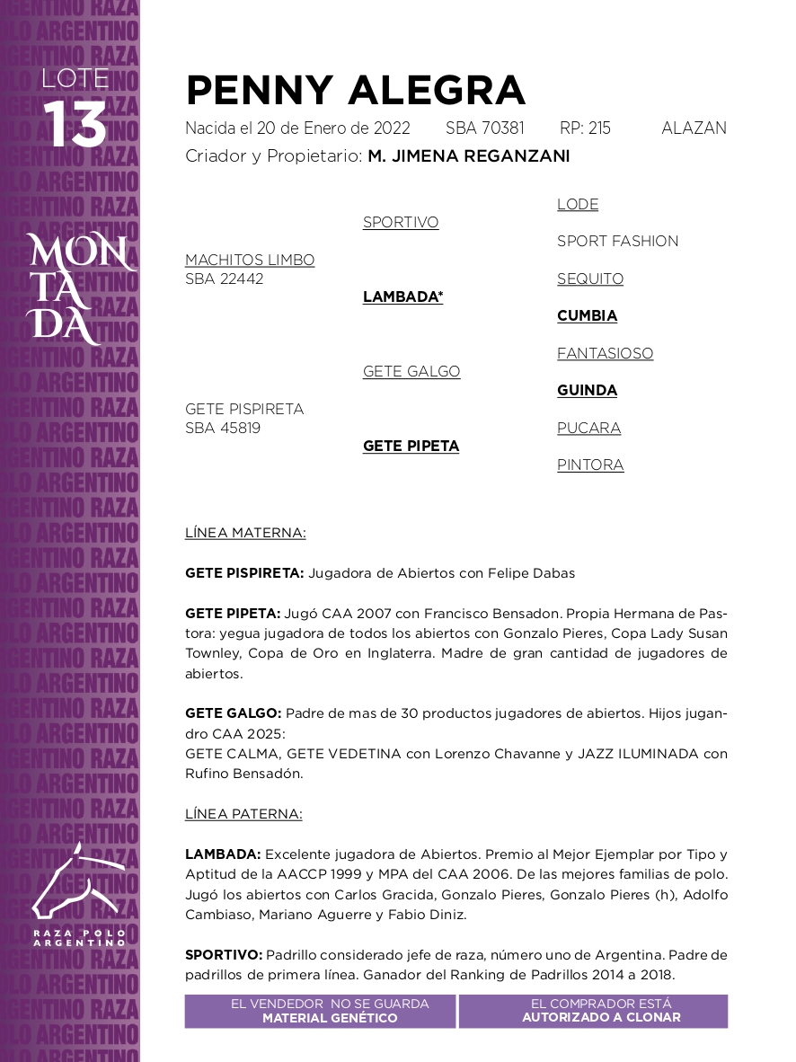 LOTE 13, PENNY ALEGRA Lote Anterior Volver al remate Lote Siguiente Ficha Contacto Ofertar Buenos Aires - Ficha del Lote Identificador: #350506 Categoría: Yeguas Montadas Pedigree Descripción: AUTORIZAN A CLONAR Buenos Aires - Ofertar AUTORIZAN A CLONAR Fecha de cierre: 27 de Noviembre a las 19:24hs. Prórroga: 2 minutos Aún no tiene ofertas Plazo: Contado 7 y 14 días 15 días 30 y 60 del remate 20 días 21 dias 30 del remate 30 días 30 y 45 dias 40 días 25 días del remate 45 días 30 y 60 días 25 y 55 días 0, 30 y 60 días 25 días 55 días 60 días 60, 90 y 120 días 30, 60 y 90 días 70 días 60 y 90 días 35 y 65 días 30 y 50 días 25 y 40 días 30 y 40 días 90 días 50 y 100 días 120 días 60 días del remate 30 y 45 Días del Remate 30 y 45 Días 20/50 y 80 días 30 días del remate 30 y 60 días del remate 30, 60 y 90 días del remate 30 y 45 Días 50 y 80 días 20 y 50 días 45 Días del Remate 17 días 15 - 50 días 28 días 30-60-90 O 60 25-55-85 25-45 días 18 días Desde el Remate 150 días 180 días 25, 55 y 85 días 30, 60, 90, 120 y 150 días 30, 60, 90 y 120 días 0, 30, 60 y 90 dias 20, 40 y 60 días 6 Cuotas Otro Consultar Su Oferta en U$S: − + Step: -1.000,00 / +1.000,00 Programar puja hasta: Programar puja hasta Aumentar puja programada 24000 42000 **Oferta al kg Iniciar sesión para ofertar Ofertar Compra por U$S 99.000.000,00 Ofertas Recibidas U$S Fecha/Hora Estado Este lote aún no tiene preofertas. ¿Estás seguro de comprar el LOTE PENNY ALEGRA por U$S 99000000 ? 119 Visualizaciones ClicData Contacto Empresa: El Rincón Polo Nombre*: Teléfono* : E-mail* : Mensaje Enviar Registrese gratis Este contenido Exclusivo está disponible sólo para usuarios registrados Ingresar