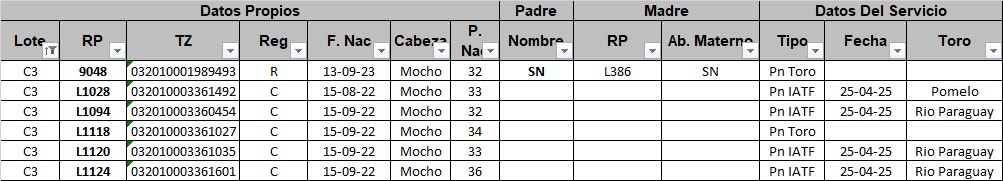 | Observaciones | Excelente lote de vaquillas preñadas RP: 9048 RP: L1028 RP: L1094 RP: L1118 RP: L1120 RP: L1124 |