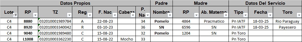 | Observaciones | Excelente lote de vaquillas preñadas RP: 8880 RP: 8920 RP: 9040 RP: L1008 |