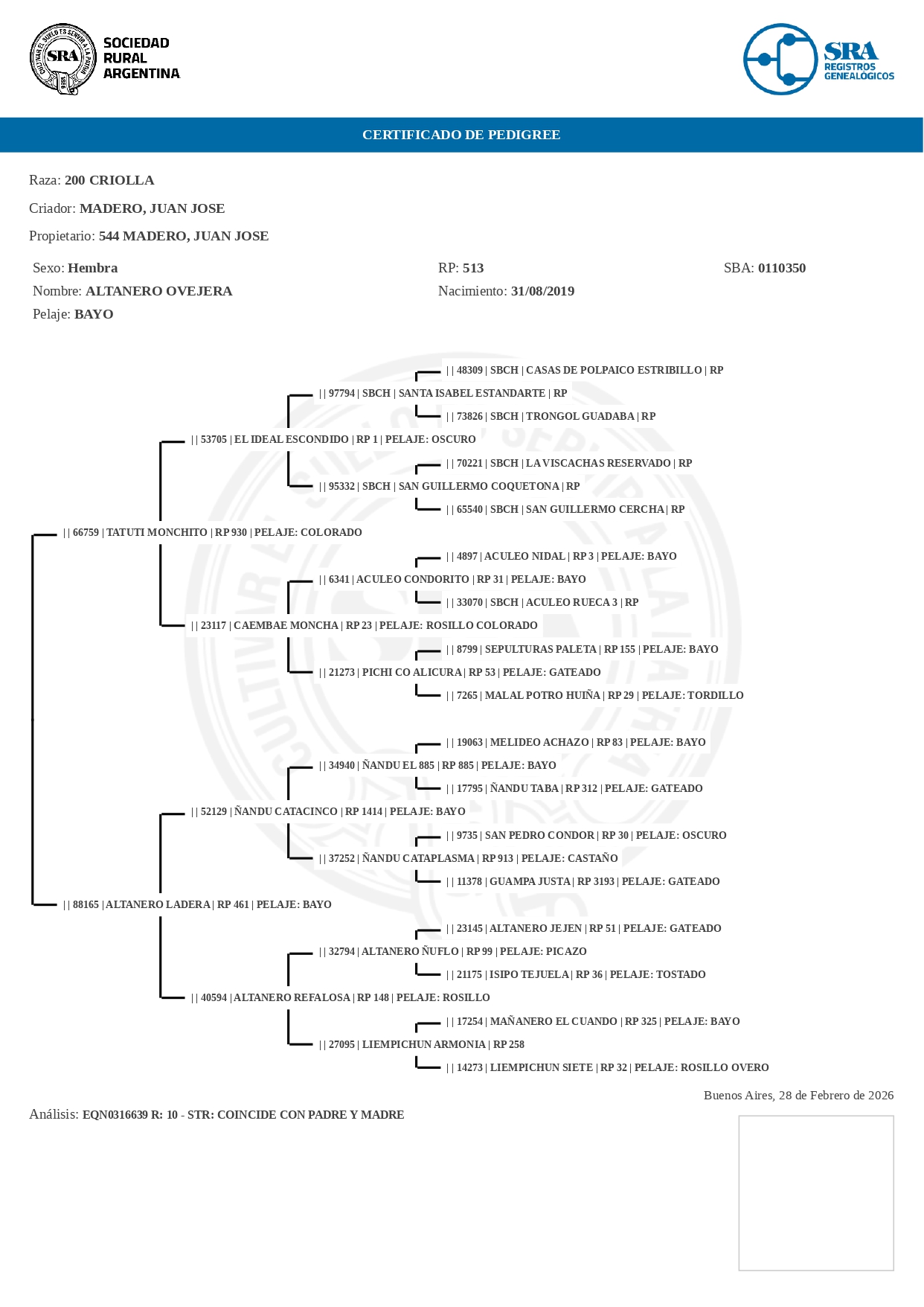 Su madre, Ladera, es una de las líneas de cria de la cabaña que viene de la rosilla Liempichun Armonia, que fue Reservada Campeon de Ayacucho e hizo la Marcha JAL.