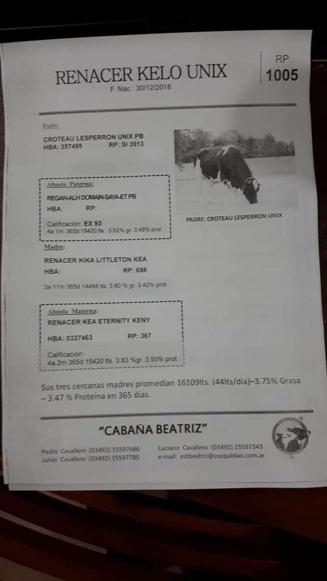 Sus tres cercanas madres promedian 16.109 lts. (44lts/día) – 3.75% grasa – 3.47% proteína en 365 días.