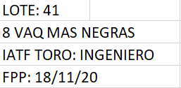 LOTE 41, 8 VAQ. MAS NEGRAS "CABAÑA EL NOROSAL" Lote Anterior Volver al remate Lote Siguiente Información del Lote Pedigree Ofertar Contacto Buenos Aires - Bolívar Información del Lote Identificador: #78899 Cantidad 8 Categoría Vaquillonas MAS preñadas Raza Angus Negro Provincia Buenos Aires Ubicación Bolívar Plazo Consultar Buenos Aires - Bolívar Ofertar Aún no tiene ofertas Plazo: Contado 7 y 14 días 15 días 30 y 60 del remate 20 días 21 dias 30 del remate 30 días 30 y 45 dias 40 días 25 días del remate 45 días 30 y 60 días 25 y 55 días 0, 30 y 60 días 25 días 55 días 60 días 60, 90 y 120 días 30, 60 y 90 días 70 días 60 y 90 días 35 y 65 días 30 y 50 días 25 y 40 días 30 y 40 días 90 días 50 y 100 días 120 días 60 días del remate 30 y 45 Días del Remate 30 y 45 Días 20/50 y 80 días 30 días del remate 30 y 60 días del remate 30, 60 y 90 días del remate 30 y 45 Días 50 y 80 días 20 y 50 días 45 Días del Remate 17 días 15 - 50 días 28 días 30-60-90 O 60 25-55-85 25-45 días 18 días Desde el Remate 150 días 180 días 25, 55 y 85 días 30, 60, 90, 120 y 150 días 30, 60, 90 y 120 días 0, 30, 60 y 90 dias 20, 40 y 60 días 6 Cuotas Otro Consultar Su Oferta en $: − + Step: -2.000,00 / +2.000,00 Programar puja hasta: Programar puja hasta Aumentar puja programada 64000 100000 **Oferta al bulto Iniciar sesión para ofertar Ofertar Listado de preofertas $ Fecha/Hora Estado Este lote aún no tiene preofertas. 101 Visualizaciones ClicData Pedigree Contacto Comercial a cargo: oscar Empresa: Cabaña Don Florencio Nombre*: E-mail* : Mensaje Enviar Registrese gratis Este contenido Exclusivo está disponible sólo para usuarios registrados Ingresar
