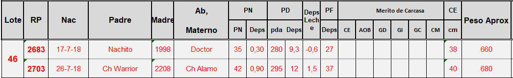 LOTE 46, TOROS PC Lote Anterior Volver al remate Lote Siguiente Información del Lote Animales del Lote Pedigree Ofertar Contacto Buenos Aires - San Andrés de Giles Información del Lote Identificador: #80665 Cantidad 2 Categoría Toros PC Raza Angus Colorado Provincia Buenos Aires Ubicación San Andrés de Giles Plazo Consultar Buenos Aires - San Andrés de Giles Ofertar Aún no tiene ofertas Animales: 2683 2703 Plazo: Contado 7 y 14 días 15 días 30 y 60 del remate 20 días 21 dias 30 del remate 30 días 30 y 45 dias 40 días 25 días del remate 45 días 30 y 60 días 25 y 55 días 0, 30 y 60 días 25 días 55 días 60 días 60, 90 y 120 días 30, 60 y 90 días 70 días 60 y 90 días 35 y 65 días 30 y 50 días 25 y 40 días 30 y 40 días 90 días 50 y 100 días 120 días 60 días del remate 30 y 45 Días del Remate 30 y 45 Días 20/50 y 80 días 30 días del remate 30 y 60 días del remate 30, 60 y 90 días del remate 30 y 45 Días 50 y 80 días 20 y 50 días 45 Días del Remate 17 días 15 - 50 días 28 días 30-60-90 O 60 25-55-85 25-45 días 18 días Desde el Remate 150 días 180 días 25, 55 y 85 días 30, 60, 90, 120 y 150 días 30, 60, 90 y 120 días 0, 30, 60 y 90 dias 20, 40 y 60 días 6 Cuotas Otro Consultar Su Oferta en $: − + Step: -5.000,00 / +5.000,00 Programar puja hasta: Programar puja hasta Aumentar puja programada 160000 250000 **Oferta al bulto Iniciar sesión para ofertar Ofertar Listado de preofertas $ Fecha/Hora Estado Este lote aún no tiene preofertas. 50 Visualizaciones ClicData Animales del Lote RP 2683 2703 PRECIO BASE 0.00 0.00 RP 2683 PRECIO BASE 0.00 RP 2703 PRECIO BASE 0.00 Pedigree Contacto Comercial a cargo: Pestalardo Empresa: GANADERA AZUL SRL Nombre*: E-mail* : Mensaje Enviar Registrese gratis Este contenido Exclusivo está disponible sólo para usuarios registrados Ingresar