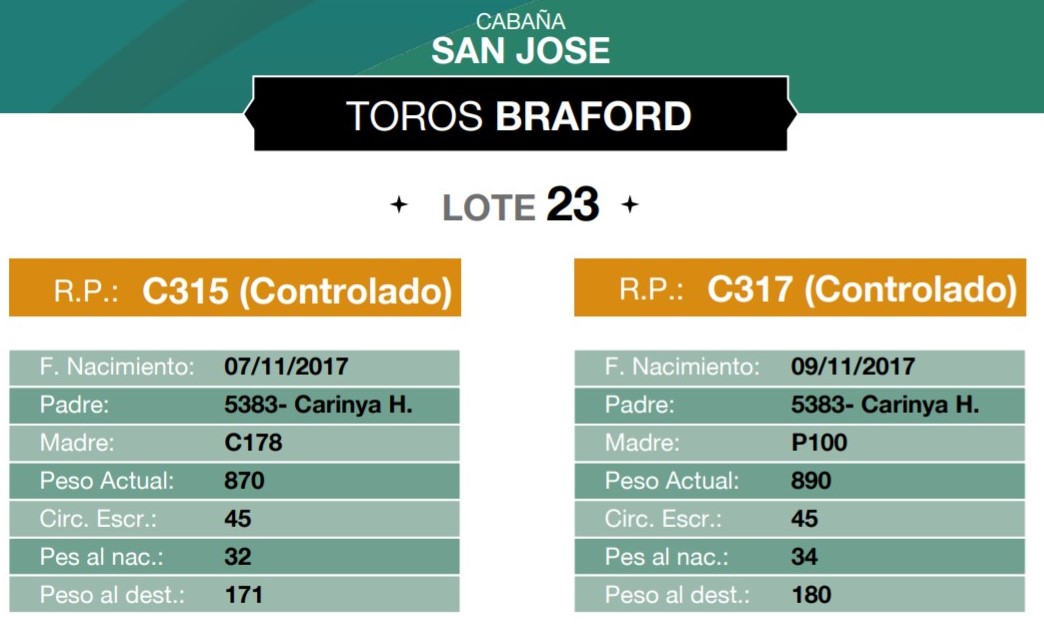 LOTE 23, TOROS BRAFORD CABAÑA SAN JOSE Lote Anterior Volver al remate Lote Siguiente Información del Lote Animales del Lote Pedigree Ofertar Contacto Chaco - Información del Lote Identificador: #82096 Cantidad 2 Categoría Toros Raza Braford Provincia Chaco Plazo Consultar Chaco - Ofertar Aún no tiene ofertas Animales: C315 (Controlado) C317 (Controlado) Plazo: Contado 7 y 14 días 15 días 30 y 60 del remate 20 días 21 dias 30 del remate 30 días 30 y 45 dias 40 días 25 días del remate 45 días 30 y 60 días 25 y 55 días 0, 30 y 60 días 25 días 55 días 60 días 60, 90 y 120 días 30, 60 y 90 días 70 días 60 y 90 días 35 y 65 días 30 y 50 días 25 y 40 días 30 y 40 días 90 días 50 y 100 días 120 días 60 días del remate 30 y 45 Días del Remate 30 y 45 Días 20/50 y 80 días 30 días del remate 30 y 60 días del remate 30, 60 y 90 días del remate 30 y 45 Días 50 y 80 días 20 y 50 días 45 Días del Remate 17 días 15 - 50 días 28 días 30-60-90 O 60 25-55-85 25-45 días 18 días Desde el Remate 150 días 180 días 25, 55 y 85 días 30, 60, 90, 120 y 150 días 30, 60, 90 y 120 días 0, 30, 60 y 90 dias 20, 40 y 60 días 6 Cuotas Otro Consultar Su Oferta en $: − + Step: -5.000,00 / +5.000,00 Programar puja hasta: Programar puja hasta Aumentar puja programada 190000 280000 **Oferta al bulto Iniciar sesión para ofertar Ofertar Listado de preofertas $ Fecha/Hora Estado Este lote aún no tiene preofertas. 140 Visualizaciones ClicData Animales del Lote RP C315 (Controlado) C317 (Controlado) PRECIO BASE 0.00 0.00 RP C315 (Controlado) PRECIO BASE 0.00 RP C317 (Controlado) PRECIO BASE 0.00 Pedigree Contacto Comercial a cargo: Santiago Usandizaga Empresa: CASA USANDIZAGA S.A. Nombre*: E-mail* : Mensaje Enviar Registrese gratis Este contenido Exclusivo está disponible sólo para usuarios registrados Ingresar