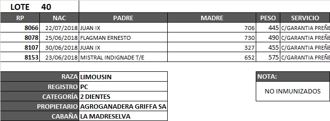 LOTE 40, VAQUILLONAS PC C/GARANTIA DE PREÑEZ LIMOUSIN Lote Anterior Volver al remate Lote Siguiente Información del Lote Animales del Lote Pedigree Ofertar Contacto Córdoba - Jesús María Información del Lote Identificador: #83458 Cantidad 4 Categoría Vaquillonas Raza Limousin Provincia Córdoba Ubicación Jesús María Plazo Consultar Propietario LA MADRESELVA Córdoba - Jesús María Ofertar Aún no tiene ofertas Animales: 8066 8078 8107 8153 Plazo: Contado 7 y 14 días 15 días 30 y 60 del remate 20 días 21 dias 30 del remate 30 días 30 y 45 dias 40 días 25 días del remate 45 días 30 y 60 días 25 y 55 días 0, 30 y 60 días 25 días 55 días 60 días 60, 90 y 120 días 30, 60 y 90 días 70 días 60 y 90 días 35 y 65 días 30 y 50 días 25 y 40 días 30 y 40 días 90 días 50 y 100 días 120 días 60 días del remate 30 y 45 Días del Remate 30 y 45 Días 20/50 y 80 días 30 días del remate 30 y 60 días del remate 30, 60 y 90 días del remate 30 y 45 Días 50 y 80 días 20 y 50 días 45 Días del Remate 17 días 15 - 50 días 28 días 30-60-90 O 60 25-55-85 25-45 días 18 días Desde el Remate 150 días 180 días 25, 55 y 85 días 30, 60, 90, 120 y 150 días 30, 60, 90 y 120 días 0, 30, 60 y 90 dias 20, 40 y 60 días 6 Cuotas Otro Consultar Su Oferta en : − + Step: -5.000,00 / +5.000,00 Programar puja hasta: Programar puja hasta Aumentar puja programada 90000 180000 **Oferta al bulto Iniciar sesión para ofertar Ofertar Listado de preofertas Fecha/Hora Estado Este lote aún no tiene preofertas. 93 Visualizaciones ClicData Animales del Lote RP 8066 8078 8107 8153 PRECIO BASE 0.00 0.00 0.00 0.00 0.00 RP 8066 PRECIO BASE 0.00 RP 8078 PRECIO BASE 0.00 RP 8107 PRECIO BASE 0.00 RP 8153 PRECIO BASE 0.00 RP PRECIO BASE 0.00 Pedigree Contacto Empresa: CONSIGNACIONES CÓRDOBA S.A. Nombre*: E-mail* : Mensaje Enviar Registrese gratis Este contenido Exclusivo está disponible sólo para usuarios registrados Ingresar