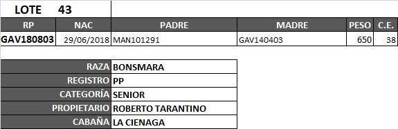 LOTE 43, TOROS PP BONSMARA Lote Anterior Volver al remate Lote Siguiente Información del Lote Animales del Lote Pedigree Ofertar Contacto Córdoba - Jesús María Información del Lote Identificador: #83461 Categoría Toros PP Raza Bonsmara Provincia Córdoba Ubicación Jesús María Plazo Consultar Propietario LA CIENAGA Córdoba - Jesús María Ofertar Aún no tiene ofertas Animales: GAV180803 Plazo: Contado 7 y 14 días 15 días 30 y 60 del remate 20 días 21 dias 30 del remate 30 días 30 y 45 dias 40 días 25 días del remate 45 días 30 y 60 días 25 y 55 días 0, 30 y 60 días 25 días 55 días 60 días 60, 90 y 120 días 30, 60 y 90 días 70 días 60 y 90 días 35 y 65 días 30 y 50 días 25 y 40 días 30 y 40 días 90 días 50 y 100 días 120 días 60 días del remate 30 y 45 Días del Remate 30 y 45 Días 20/50 y 80 días 30 días del remate 30 y 60 días del remate 30, 60 y 90 días del remate 30 y 45 Días 50 y 80 días 20 y 50 días 45 Días del Remate 17 días 15 - 50 días 28 días 30-60-90 O 60 25-55-85 25-45 días 18 días Desde el Remate 150 días 180 días 25, 55 y 85 días 30, 60, 90, 120 y 150 días 30, 60, 90 y 120 días 0, 30, 60 y 90 dias 20, 40 y 60 días 6 Cuotas Otro Consultar Su Oferta en : − + Step: -5.000,00 / +5.000,00 Programar puja hasta: Programar puja hasta Aumentar puja programada 190000 280000 **Oferta al bulto Iniciar sesión para ofertar Ofertar Listado de preofertas Fecha/Hora Estado Este lote aún no tiene preofertas. 139 Visualizaciones ClicData Animales del Lote RP GAV180803 PRECIO BASE 0.00 0.00 RP GAV180803 PRECIO BASE 0.00 RP PRECIO BASE 0.00 Pedigree Contacto Empresa: CONSIGNACIONES CÓRDOBA S.A. Nombre*: E-mail* : Mensaje Enviar Registrese gratis Este contenido Exclusivo está disponible sólo para usuarios registrados Ingresar