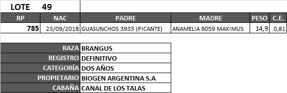 LOTE 49, TORO BRANGUS REG. DEFINITIVO 🔥 🔥 🔥 Lote Anterior Volver al remate Lote Siguiente Información del Lote Animales del Lote Pedigree Ofertar Contacto Córdoba - Jesús María Información del Lote Identificador: #83467 Categoría Toros Raza Brangus negro Provincia Córdoba Ubicación Jesús María Propietario CANAL DE LOS TALAS Córdoba - Jesús María Ofertar Aún no tiene ofertas Animales: 785 Plazo: Contado 7 y 14 días 15 días 30 y 60 del remate 20 días 21 dias 30 del remate 30 días 30 y 45 dias 40 días 25 días del remate 45 días 30 y 60 días 25 y 55 días 0, 30 y 60 días 25 días 55 días 60 días 60, 90 y 120 días 30, 60 y 90 días 70 días 60 y 90 días 35 y 65 días 30 y 50 días 25 y 40 días 30 y 40 días 90 días 50 y 100 días 120 días 60 días del remate 30 y 45 Días del Remate 30 y 45 Días 20/50 y 80 días 30 días del remate 30 y 60 días del remate 30, 60 y 90 días del remate 30 y 45 Días 50 y 80 días 20 y 50 días 45 Días del Remate 17 días 15 - 50 días 28 días 30-60-90 O 60 25-55-85 25-45 días 18 días Desde el Remate 150 días 180 días 25, 55 y 85 días 30, 60, 90, 120 y 150 días 30, 60, 90 y 120 días 0, 30, 60 y 90 dias 20, 40 y 60 días 6 Cuotas Otro Consultar Su Oferta en : − + Step: -5.000,00 / +5.000,00 Programar puja hasta: Programar puja hasta Aumentar puja programada 190000 280000 **Oferta al bulto Iniciar sesión para ofertar Ofertar Listado de preofertas Fecha/Hora Estado Este lote aún no tiene preofertas. 156 Visualizaciones ClicData Animales del Lote RP 785 PRECIO BASE 0.00 0.00 RP 785 PRECIO BASE 0.00 RP PRECIO BASE 0.00 Pedigree Contacto Empresa: CONSIGNACIONES CÓRDOBA S.A. Nombre*: E-mail* : Mensaje Enviar Registrese gratis Este contenido Exclusivo está disponible sólo para usuarios registrados Ingresar