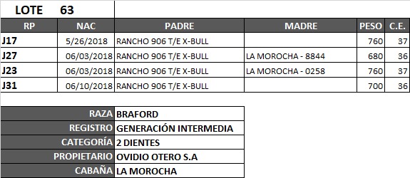 LOTE 63, TORO BRAFORD GEN. INTERMEDIA Lote Anterior Volver al remate Lote Siguiente Información del Lote Animales del Lote Pedigree Ofertar Contacto Córdoba - Jesús María Información del Lote Identificador: #83481 Cantidad 4 Categoría Toros Raza Braford Provincia Córdoba Ubicación Jesús María Plazo Consultar Propietario LA MOROCHA Córdoba - Jesús María Ofertar Aún no tiene ofertas Animales: J17 J27 J23 J31 Plazo: Contado 7 y 14 días 15 días 30 y 60 del remate 20 días 21 dias 30 del remate 30 días 30 y 45 dias 40 días 25 días del remate 45 días 30 y 60 días 25 y 55 días 0, 30 y 60 días 25 días 55 días 60 días 60, 90 y 120 días 30, 60 y 90 días 70 días 60 y 90 días 35 y 65 días 30 y 50 días 25 y 40 días 30 y 40 días 90 días 50 y 100 días 120 días 60 días del remate 30 y 45 Días del Remate 30 y 45 Días 20/50 y 80 días 30 días del remate 30 y 60 días del remate 30, 60 y 90 días del remate 30 y 45 Días 50 y 80 días 20 y 50 días 45 Días del Remate 17 días 15 - 50 días 28 días 30-60-90 O 60 25-55-85 25-45 días 18 días Desde el Remate 150 días 180 días 25, 55 y 85 días 30, 60, 90, 120 y 150 días 30, 60, 90 y 120 días 0, 30, 60 y 90 dias 20, 40 y 60 días 6 Cuotas Otro Consultar Su Oferta en : − + Step: -5.000,00 / +5.000,00 Programar puja hasta: Programar puja hasta Aumentar puja programada 160000 250000 **Oferta al bulto Iniciar sesión para ofertar Ofertar Listado de preofertas Fecha/Hora Estado Este lote aún no tiene preofertas. 81 Visualizaciones ClicData Animales del Lote RP J17 J27 J23 J31 PRECIO BASE 0.00 0.00 0.00 0.00 0.00 RP J17 PRECIO BASE 0.00 RP J27 PRECIO BASE 0.00 RP J23 PRECIO BASE 0.00 RP J31 PRECIO BASE 0.00 RP PRECIO BASE 0.00 Pedigree Contacto Empresa: CONSIGNACIONES CÓRDOBA S.A. Nombre*: E-mail* : Mensaje Enviar Registrese gratis Este contenido Exclusivo está disponible sólo para usuarios registrados Ingresar