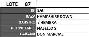 LOTE 89, BORREGA HAMPSHIRE DOWN Lote Anterior Volver al remate Lote Siguiente Ficha Contacto Ofertar Córdoba - Jesús María Ficha del Lote Identificador: #83507 Categoría: Borregas Pedigree Plazo Consultar Raza Hampshire Down Información Genética RP 326 RP 326 PRECIO BASE 0.00 RP RP PRECIO BASE 0.00 Córdoba - Jesús María Ofertar Aún no tiene ofertas Animales: 326 Plazo: Contado 7 y 14 días 15 días 30 y 60 del remate 20 días 21 dias 30 del remate 30 días 30 y 45 dias 40 días 25 días del remate 45 días 30 y 60 días 25 y 55 días 0, 30 y 60 días 25 días 55 días 60 días 60, 90 y 120 días 30, 60 y 90 días 70 días 60 y 90 días 35 y 65 días 30 y 50 días 25 y 40 días 30 y 40 días 90 días 50 y 100 días 120 días 60 días del remate 30 y 45 Días del Remate 30 y 45 Días 20/50 y 80 días 30 días del remate 30 y 60 días del remate 30, 60 y 90 días del remate 30 y 45 Días 50 y 80 días 20 y 50 días 45 Días del Remate 17 días 15 - 50 días 28 días 30-60-90 O 60 25-55-85 25-45 días 18 días Desde el Remate 150 días 180 días 25, 55 y 85 días 30, 60, 90, 120 y 150 días 30, 60, 90 y 120 días 0, 30, 60 y 90 dias 20, 40 y 60 días 6 Cuotas Otro Consultar Su Oferta en : − + Step: -5.000,00 / +5.000,00 Programar puja hasta: Programar puja hasta Aumentar puja programada 40000 130000 **Oferta al kg Iniciar sesión para ofertar Ofertar Listado de preofertas Fecha/Hora Estado Este lote aún no tiene preofertas. 112 Visualizaciones ClicData Contacto Empresa: CONSIGNACIONES CÓRDOBA S.A. Nombre*: Teléfono* : E-mail* : Mensaje Enviar Registrese gratis Este contenido Exclusivo está disponible sólo para usuarios registrados Ingresar