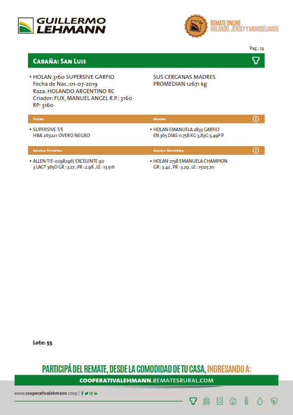 LOTE 55, TORO HOLANDO Lote Anterior Volver al remate Lote Siguiente Ficha Contacto Santa Fe - Ficha del Lote Identificador: #93444 Categoría: Toros Pedigree Plazo 30, 60, 90 y 120 días Raza Holando 63 Visualizaciones ClicData Contacto Comercial a cargo: Julio Empresa: Cooperativa Agrícola Ganadera Guillermo Lehmann Nombre*: Teléfono* : E-mail* : Mensaje Enviar Registrese gratis Este contenido Exclusivo está disponible sólo para usuarios registrados Ingresar