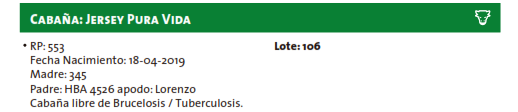 LOTE 106, TORO JERSEY Lote Anterior Volver al remate Lote Siguiente Información del Lote Pedigree Contacto Santa Fe - Información del Lote Identificador: #96673 Categoría Toros Raza Jersey Estado Excelente Provincia Santa Fe Plazo 30, 60, 90 y 120 días Santa Fe - 148 Visualizaciones ClicData Pedigree Contacto Comercial a cargo: Alan Zbrun Empresa: Cooperativa Agrícola Ganadera Guillermo Lehmann Nombre*: E-mail* : Mensaje Enviar Registrese gratis Este contenido Exclusivo está disponible sólo para usuarios registrados Ingresar