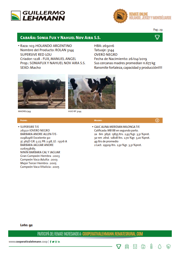 LOTE 92, TORO HOLANDO Lote Anterior Volver al remate Lote Siguiente Información del Lote Pedigree Contacto Santa Fe - Información del Lote Identificador: #96675 Categoría Toros Raza Holando Argentino Estado Excelente Provincia Santa Fe Plazo 30, 60, 90 y 120 días Santa Fe - 130 Visualizaciones ClicData Pedigree Contacto Comercial a cargo: Alan Zbrun Empresa: Cooperativa Agrícola Ganadera Guillermo Lehmann Nombre*: E-mail* : Mensaje Enviar Registrese gratis Este contenido Exclusivo está disponible sólo para usuarios registrados Ingresar